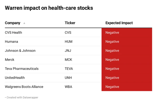 Subramanianová je přesvědčená, že nejvíce by vítězství Warrenové ve volbách dopadlo na sektor zdravotní péče, a to především proto, že jde o urputnou zastánkyni zdravotního pojištění Medicare pro všechny. Dopady tohoto opatření by přitom podle Subramanianové nepocítily jen pojišťovny, ale i farmaceutické podniky a další firmy z odvětví. Warrenová je také odhodlaná bojovat s opioidovou krizí, což by opět výrazně pocítily hlavně farmaceutické firmy.