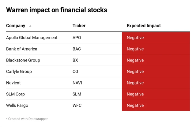 Warrenová je dobře známá rovněž coby kritička velkých finančních domů, private equity firem a dalších finančních institucí. Podle Subramanianové je tak více než pravděpodobné, že by příchod Warrenové do Bílého domu byl předznamenáním zpřísňování regulace finančního sektoru. "Private equity firmy například Warrenová vyobrazuje jako osu zla v americké ekonomice," upozorňuje Subramanianová.