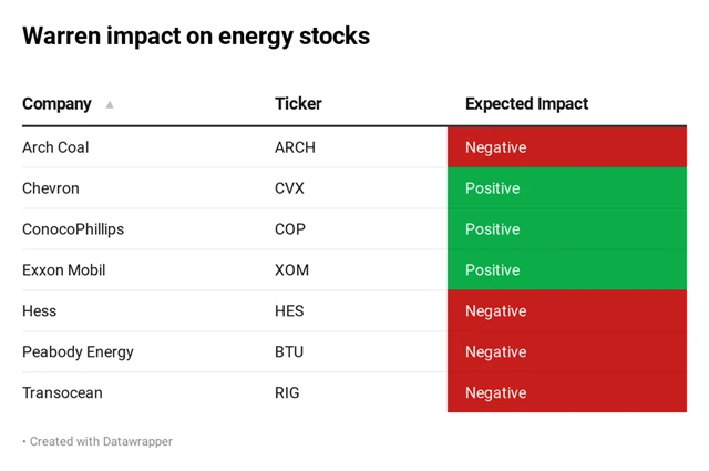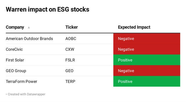 Podporou by vítězství Warrenové v prezidentských volbách mohlo být pro podniky, které se chlubí nálepkami "společensky odpovědné podnikání" a "udržitelné podnikání". Úsměv z tváře by naopak její úspěch zřejmě vzal třeba provozovatelům soukromých věznic nebo výrobcům a prodejcům osobních střelných zbraní.