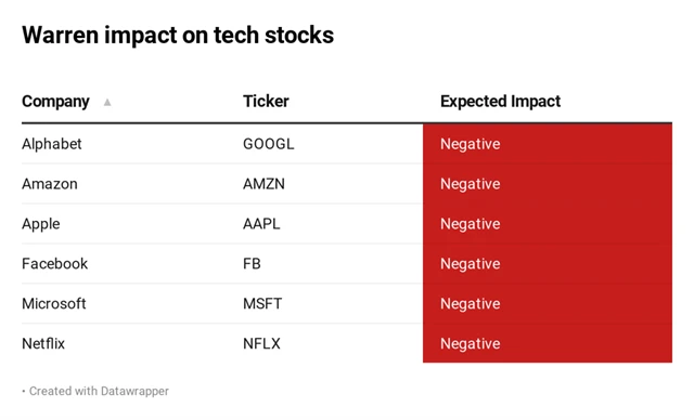 Warrenová rozhodně není fanynkou obřích technologických společností. Dobře známý je například její kritický pohled na zakladatele Facebooku Marka Zuckerberga. V březnu například napsala: "Tyto firmy smazaly z odvětví soutěž a naše soukromá data změnily ve svůj zisk. To je důvod, proč má administrativa v tomto sektoru provede velké, strukturální změny, které podpoří soutěž, a to včetně rozdělení Amazonu, Facebooku a Googlu."