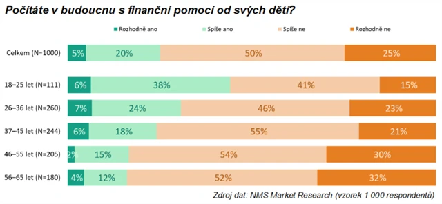 Jen každý pátý Čech počítá s tím, že by mu v pozdním věku finančně vypomáhaly děti. V kategorii nad 56 let, pro kterou je tato otázka nejaktuálnější, na peněžní pomoc spoléhá jen 16 % dotázaných.