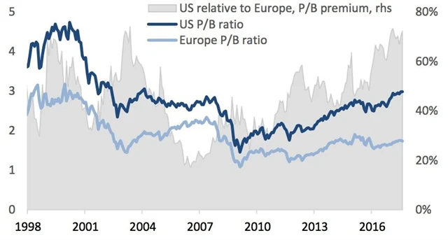 V USA je prakticky všechno větší - auta, domy, porce jídla i ocenění akcií. Americké společnosti jsou v současnosti 3,1krát hodnotnější, než je jejich účetní hodnota (podle ukazatele P/B, price to book ratio). U evropských akcií je poměr ceny akcií a účetní hodnoty na úrovni 1,9. Na první pohled je tak jejich ohodnocení (vůči americkým firmám) velice zajímavé.
