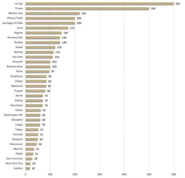 Z druhé strany žebříčku získalo prvenství jihoafrické Kapské Město, kde podle průzkumu 300 tisíc eur stačí na luxusní vilu o rozloze 600 m2. Praha je středně drahá, za zmíněnou cenu se prodávají byty o výměře zhruba 80 m2.