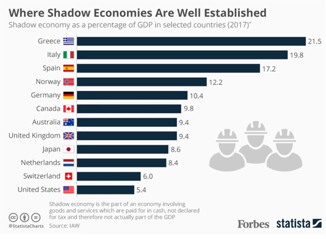 Není země, ve které by neexistovala šedá ekonomika. Ve většině vyspělého světa její objem nedosahuje ani 10 % oficiálního HDP, najdou se ale i výjimky.
