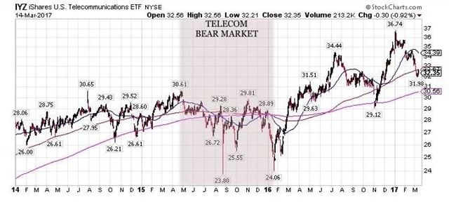 Ani některá odvětví považovaná za defenzivnější se nevyhnula medvědímu trendu. Příkladem jsou telekomunikace, které po nevýrazném pohybu do strany zaznamenaly medvědí trh (-21 %) mezi dubnem 2015 a lednem 2016.