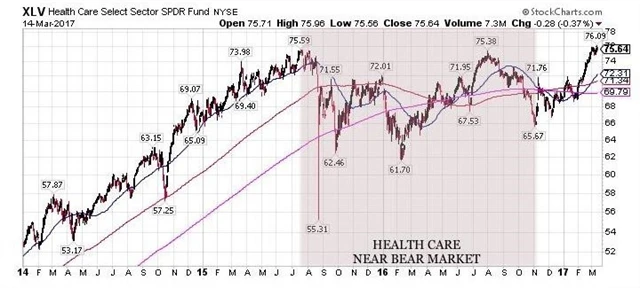 Dalším typicky defenzivním sektorem je zdravotní péče, která se sice do medvědího trendu nepropadla, ale mnoho jí k tomu mezi červencem 2015 a listopadem 2016 nechybělo (-18 %). Zdravotnictví se přitom problémy možná nebudou vyhýbat ani v budoucnu, jelikož se v USA chystá reforma a Trumpova administrativa může zasahovat například do cen léků.