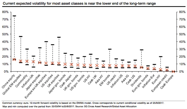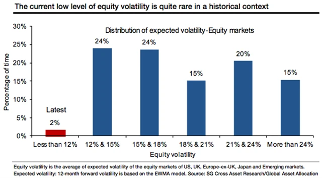 Podle Société Générale nemusí být další medvědí trend hned za dveřmi, prostředí minimální volatility by ale mělo investory přimět k větší obezřetnosti. A nejde jen o akcie. "Většina tříd aktiv vykazuje cenovou volatilitu na spodní hraně dlouhodobého rozpětí. Přitom právě míra kolísavosti cen je ukazatel, který má tendenci se vracet k průměru," napsal klientům stratég Alain Bokobza, který má na starosti globální alokaci investic.