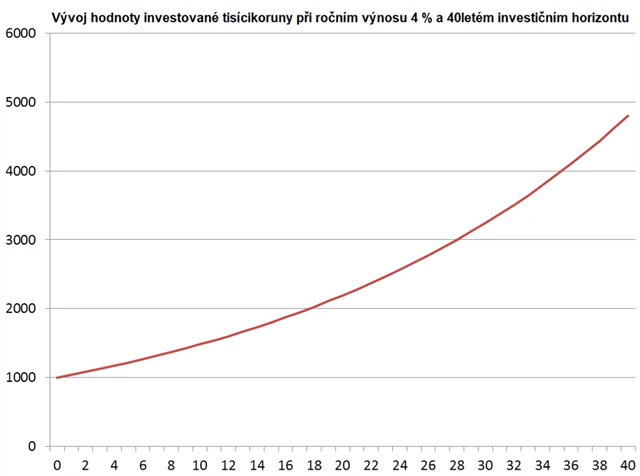 Z grafu je patrné, že sklon křivky se postupně zvyšuje, což lze přeložit tak, že úroky se v průběhu času stále více samy zhodnocují, vývoj celkového zhodnocení není lineární, ale exponenciální. Po dvaceti letech je hodnota investice 2 191 korun, výnos tedy činí 1 191 korun (výnos 119 %). Za dalších dvacet let na konci 40letého investičního horizontu je hodnota investice 4 801 korun, výnos tedy je 3 801 korun (celkový výnos 380 %).