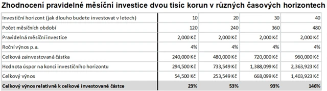 Celkový výnos opět neroste v čase lineárně, nýbrž exponenciálně, neboť působí složené úročení. Pokud budeme investovat deset let, celkový výnos bude 23 %. Pokud budeme investovat dvacet let, výnos bude dokonce 53 %. Tento efekt složeného úročení se v čase exponenciálně zvyšuje, což znamená, že pokud budeme pravidelně každý měsíc investovat dva tisíce po dobu čtyřiceti let, celkový výnos bude velice solidních 146 %. Za čtyřicet let jsme celkem zainvestovali 960 tisíc korun, celková hodnota úspor bude bezmála dva a půl milionu korun a výnos dosáhne téměř jednoho a půl milionu