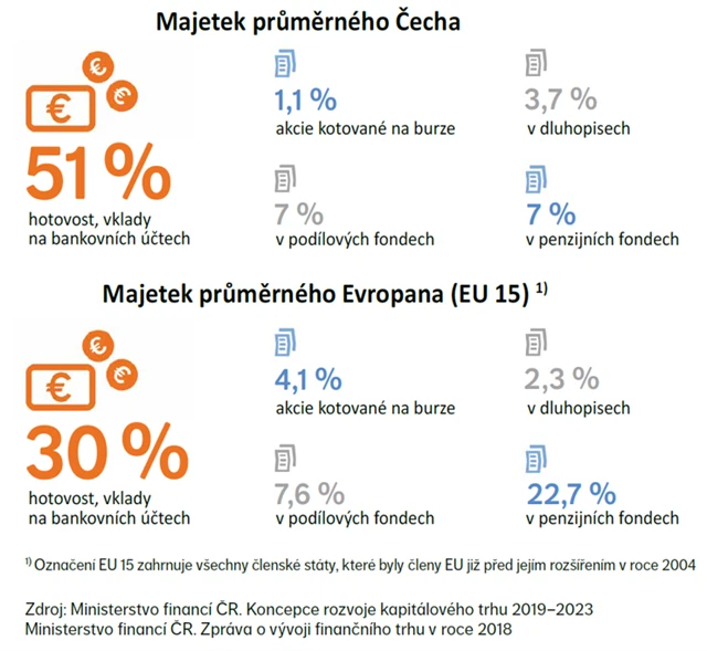 Podle zprávy Světové banky české domácnosti investují pouze 19 % peněz do akciových fondů, zatímco smíšené fondy tvoří 40 % a dluhopisové 35 % jejich portfolií. Až 51 % majetku drží Češi v hotovosti nebo na bankovních účtech. Nejvýraznější rozdíl je znát na penzijních produktech, kde mají Češi naspořeno v průměru třináctkrát méně než Evropané.