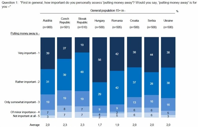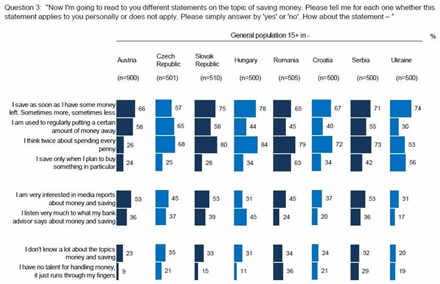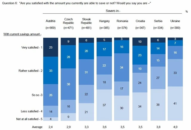 Pouze 20 až 30 % Středo- a Východoevropanů - ve srovnání s více než polovinou Rakušanů a Němců - je spokojeno s obnosem, který v současné době dokáže uspořit. Nejméně spokojeni jsou Ukrajinci, následují Srbové a Maďaři. Podobně vypadá i odhad vlastní finanční situace. Zatímco většina Rakušanů a Němců hodnotí své osobní finanční poměry jako celkem dobré, více než každý druhý Ukrajinec nebo Rumun není se svou vlastní finanční situací spokojený.