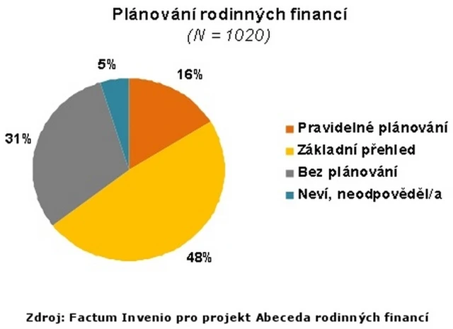 Češi se budou učit, jak pracovat s rodinným rozpočtem. Nový projekt Abeceda rodinných financí by je měl naučit pracovat s rodinným rozpočtem. O tom, že je taková výuka nutná, vypovídá i průzkum agentury Factum Invenio, podle kterého třetina dospělých obyvatel České republiky nemá přehled o svých příjmech a výdajích.