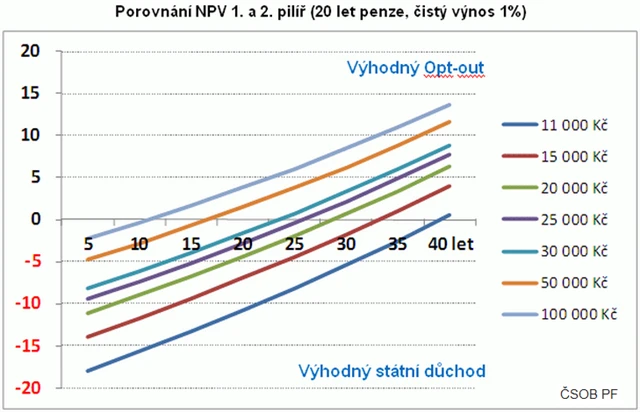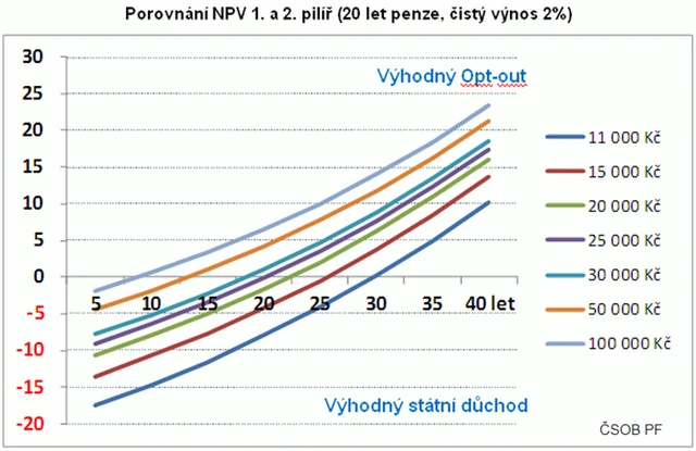 Z grafu i propočtů vychází, že se opt-out vyplácí u lidí s průměrným příjmem při 25 a více letech spoření. Pro lidi s podprůměrným příjmem se spoření vyplácí až při 40 letech spoření – a tedy není vhodné, aby státní průběžný pilíř opouštěli.
