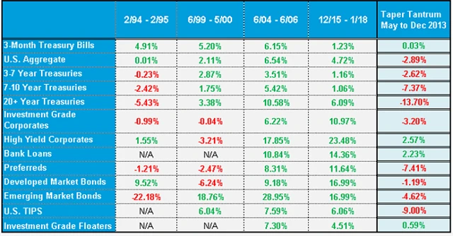 Kathy Jonesová ze společnosti Charles Schwab vysvětluje chování dluhopisových trhů na čtyřech posledních příkladech, kdy došlo ke zpřísňování monetární politiky Fedu, a na období v roce 2013 známém jako taper tantrum, kdy došlo ke krátkodobému rychlému nárůstu výnosů. V tabulce jsou takzvaně total return zisky různých aktiv s pevným výnosem v průběhu těchto období, přičemž jde o takzvaně "kumulativní periodické výnosy" (cummulative periodic returns), které zahrnují automatické reinvestování měsíčních plateb bez započítání poplatků.