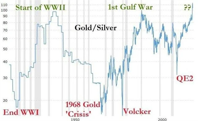 Jakmile se poměr ceny zlata a stříbra vymanil z rozmezí 50-80, došlo poměrně rychle ke korekci cen a návratu poměru do tohoto pásma. V posledních týdnech tento poměr vystřelil až do blízkosti 120, což byl rekord doslova tisíciletý.