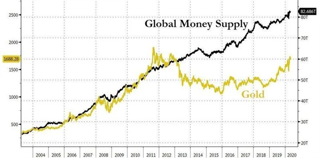Vůči peněžní zásobě není nyní zlato nijak předražené. V důsledku aktuálních masivních dodávek peněz do ekonomiky by proto zlato mohlo dále zdražovat.