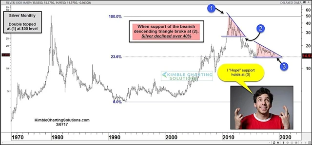 Cena stříbra na měsíčním grafu vytvořila již druhý klesající (medvědí) trojúhelník, tentokrát s podporou na ceně okolo 14 USD za trojskou unci. Když se před několika lety vytvořil podobný trojúhelník po konci býčího trendu, prolomení hladiny podpory otevřelo dveře k propadu ceny stříbra o více než 40 %.