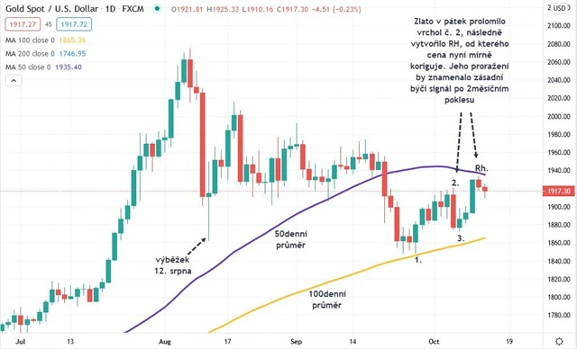 Na trhu se zlatem nastala klasická formace 1-2-3, kterou proslavil známý burzovní obchodník Joe Ross. Tento vzorec (pattern) je obecně známý a považuje se za silnou obchodní formaci, neboť signalizuje obrat trendu. Pointa je v tom, že po delším sestupném nebo růstovém trendu (v tomto konkrétním případě u zlata se jednalo o trend sestupný, kdy cena dosud klesala od 7. srpna do 28. září) nastane nejnižší cena, kterou označuje bod 1. Od bodu 1 cena začne růst a vytvoří vrchol (2), od kterého začne opět klesat, aby se vytvořil bod 3, který je však na vyšší ceně než bod 1. Následně musí do tří dnů nastat proražení vrcholu 2, což v případě zlata nastalo již druhým dnem.
