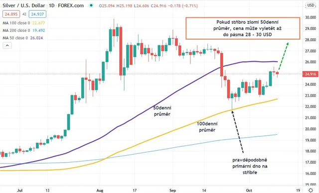 Vývoj ceny stříbra byl v uplynulém týdnu v podstatě totožný s vývojem ceny zlata, jen s tím rozdílem, že stříbro přidalo od minima z 24. září již úctyhodných 15 %. Také cena stříbra je vzdálena jen kousek od 50denního průměru, jeho případné proražení výše může kurz katapultovat až do pásma 28-30 USD za unci.