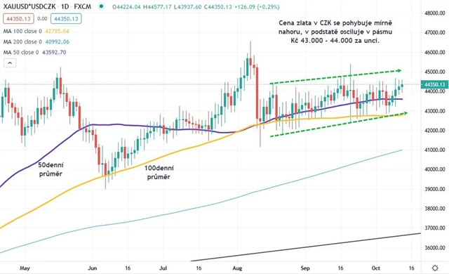 Cena unce zlata v českých korunách nadále osciluje v pásmu 43 000 až 44 000, má nicméně tendenci se spíše mírně zvedat.