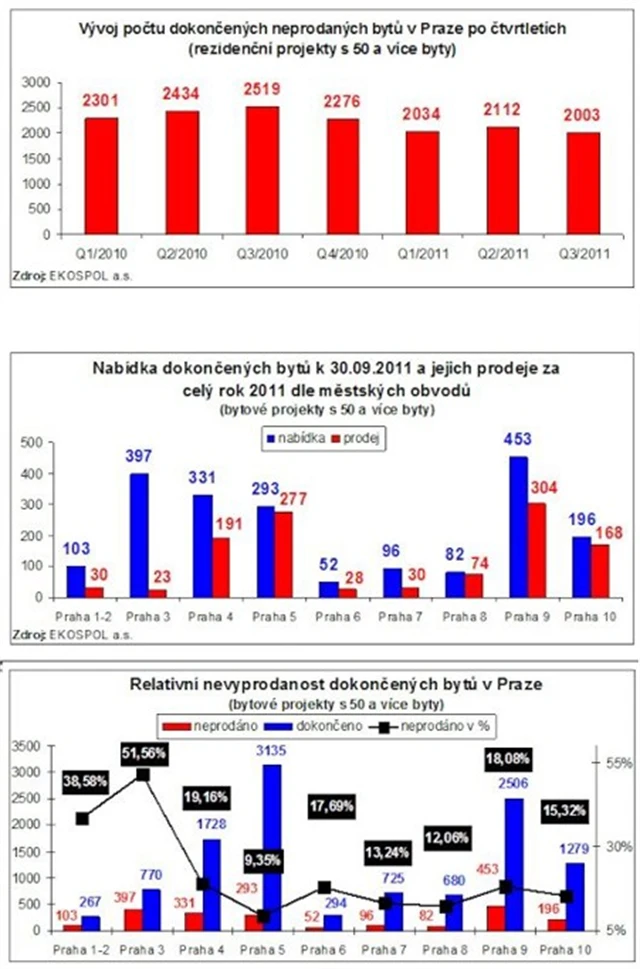 K 30. 09. 2011 napočítali analytici společnosti EKOSPOL celkem 2 003 dokončených neprodaných bytů. Vezmeme-li v úvahu fakt, že vedle velkých developerských projektů s 50 a více byty, které EKOSPOL monitoruje, tvoří část pražské nabídky také menší rezidenční areály, je velmi pravděpodobné, že celková suma neprodaných dokončených bytů šplhá k hranici 2 500.
