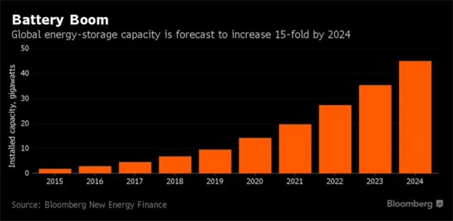 Následující graf ukazuje, že se celosvětová kapacita instalovaných systémů pro skladování elektrické energie kontinuálně zvyšuje a v dalších letech by měl její růst zrychlovat. Kolem roku 2024 by se měla světová kapacita instalovaných úložišť energie blížit 50 gigawattům, proti současnosti by tak měla být 15násobná.