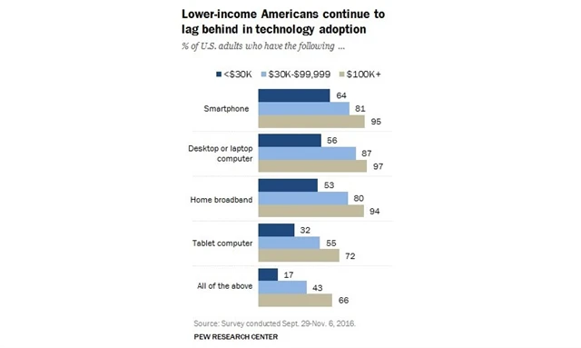 Téměř polovina Američanů s příjmy nižšími než 30 000 dolarů ročně nemá doma přístup k vysokorychlostnímu internetu a třetina nemá chytrý telefon, říkají aktuální data od Pew Research. A tato, i když na první pohled nevýznamná nedostupnost technologií prohlubuje nerovnost v bohatství jednotlivých sociálních skupin.