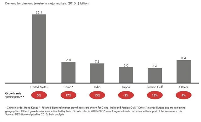 Čínská a indická střední třída se do roku 2020 zdvojnásobí, což povede k výraznému růstu poptávky. Tyto dvě země by společně měly zaujmout koncem desetiletí třetinu diamantového trhu, tedy skoro o polovinu více, než na ně připadá dnes. Jejich tržní podíl by se měl téměř vyrovnat podílu USA.