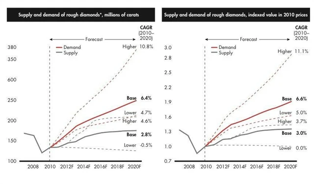 Poptávka po diamantech poroste v příští dekádě více než 6% ročním tempem a je téměř jisté, že tak předčí 2,8% růst nabídky. Podle reportu Bain & Company v pověření Antwerp World Diamond Centre (AWDC) to povede v diamantovém průmyslu ke strukturálním nedostatkům a signalizuje to růst cen, a to zejména ve vícekarátovém segmentu. I nejkonzervativnější scénáře předpovídají 60miliardovému diamantovému šperkařskému byznysu slibnou budoucnost.
