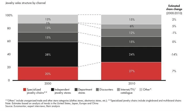 Rodinná diamantová šperkařství (často jde o tradiční živnosti provozované po čtyři až pět generací) budou postižena nejcitelněji. Specializované maloobchodní řetězce se budou snažit ukrojit si pro sebe stále větší tržní podíl. Zatímco tržní podíl specializovaných šperkařských řetězců rostl z 20 % v roce 2000 na 27 % v roce 2010, tržní podíl nezávislých šperkařských obchodů spadl z 38 % na 24 %.