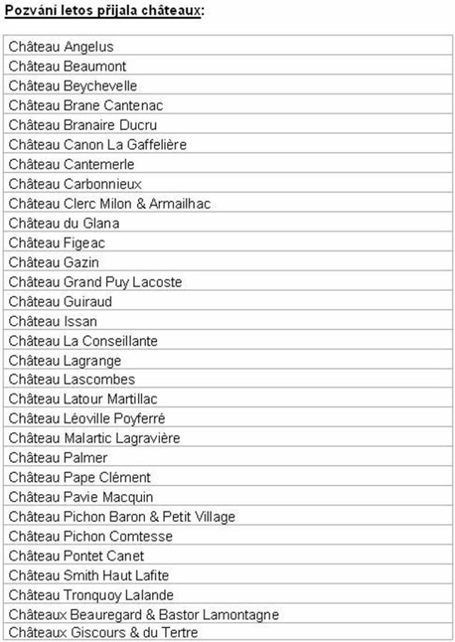 Kromě tradičních účastníků, jakými jsou Ch. Figeac, Ch. Angélus nebo Ch. La Coseillante, přijala letos pozvání i châteaux, která se neúčastní každý rok, například Pichon Longueville Comtesse nebo po loňském úspěchu Ch. Pape Clément.