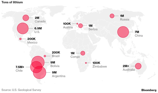 Světové zásoby lithia ve vybraných lokalitách (v tunách)