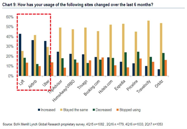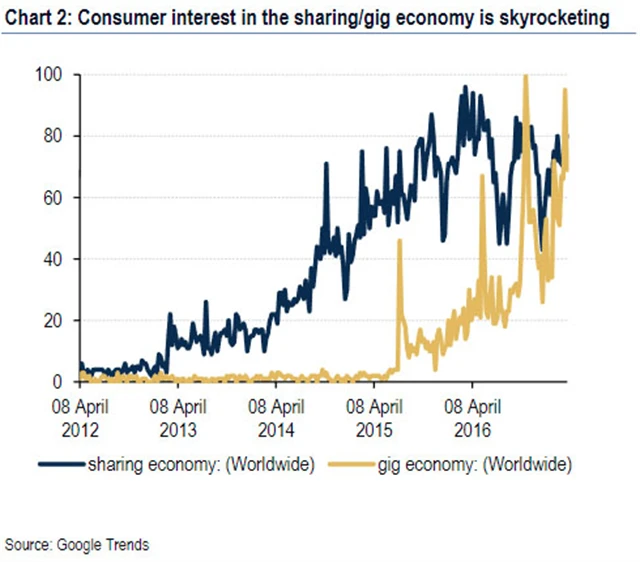 Nejen rozsahem, ale i rychlostí penetrace přitom sdílení předstihlo mnohé stále žhavé trendy. Uber a Lyft v roce 2016, necelých deset let poté, co se objevily, hlásily zábor 5,1 % relevantního amerického trhu. E-commerce se chlubí 9% podílem na maloobchodních tržbách více než dvacet let poté, co byla jako koncept představena. I z toho vycházejí odhady, podle kterých by sdílená ekonomika měla mezi roky 2015 a 2025 nabobtnat o více než 2 200 % na 335 miliard dolarů.