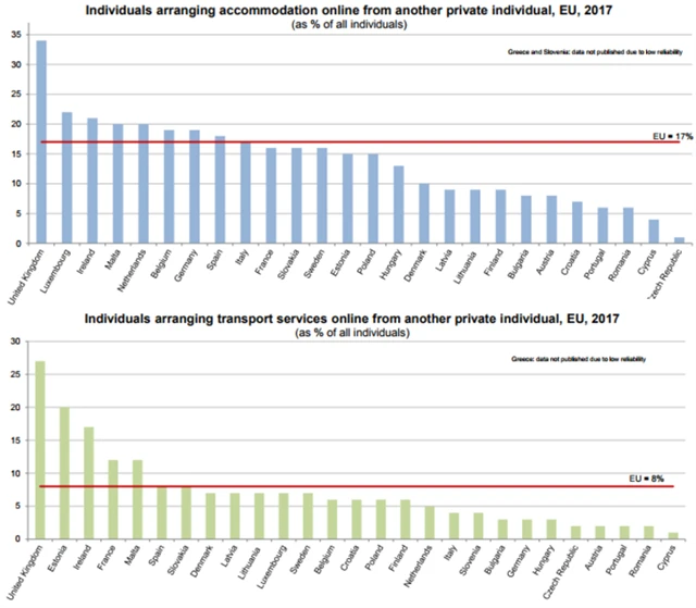 Podle Eurostatu si v posledním roce přes aplikaci objednalo privátní ubytování (například Airbnb) 17 % lidí, tedy jeden ze šesti obyvatel zemí Evropské unie. V Británii to byla více než třetina lidí, Češi jsou na opačném konci žebříčku s jedním procentem. Častěji si objednáváme privátní dopravu (třeba BlaBlaCar, Uber), kde jsou to procenta dvě. V případě dopravy je průměr EU na 8 % a v čele je opět Spojené království, shrnuje hlavní ekonom České spořitelny David Navrátil.
