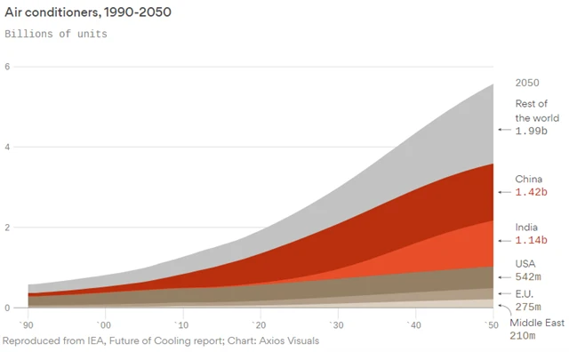 To by znamenalo, že v roce 2050 budou klimatizace spotřebovávat zhruba stejný objem energie jako dnes celá Čína. Klimatizace by měly jít na odbyt především na Středním východě a v jihovýchodní Asii, a to jak jinak než v důsledku rostoucích teplot. IEA dokonce tvrdí, že globální nárůst emisí CO2 do roku 2050 půjde z bezmála 20 % na vrub právě klimatizacím.