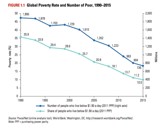 Podle Světové banky se míra chudoby ve světě za poslední roky výrazně snížila. Počet lidí, kteří mají na den méně než 1,9 USD, se mezi lety 2013 a 2015 (poslední dostupná oficiální data) snížil o 68 milionů na 736 milionů lidí. To číslo stále vypadá hrozivě, ale když vezmeme v úvahu, že míra chudých lidí klesla z 35,9 % v roce 1999 na 10 % v roce 2015, zní to pozitivněji. V roce 2018 by měla míra extrémní chudoby klesnout na 8,6 % a cílem Světové banky jsou 3 % v roce 2030.