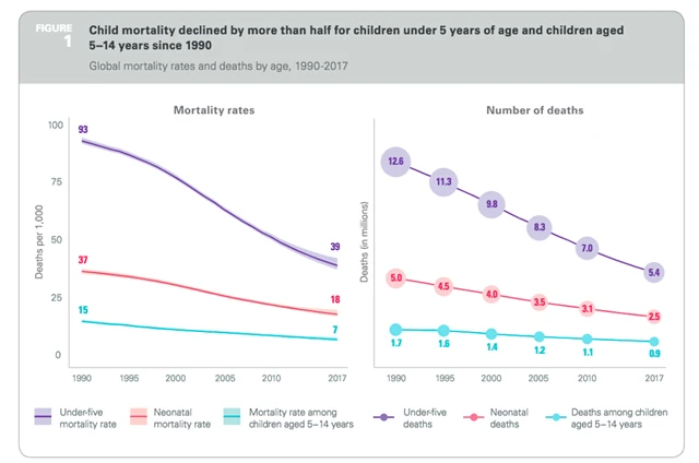 Další pozitivní statistikou, mimochodem související s klesající chudobou, je pokles počtu dětí, které zemřou hned po porodu nebo do pěti let věku. I zde je trend pozitivní, mezi lety 1990 a 2017 klesl počet dětí umírajících do pěti let po narození z 9,3 % na 3,9 %. O téměř polovinu za tu dobu klesl také počet dětí, které zemřely ve věku mezi pěti a čtrnácti lety.