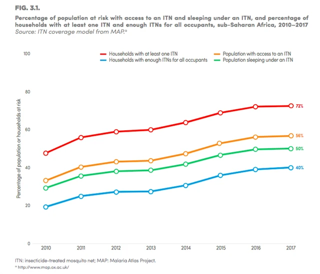 Další statistika, která souvisí s klesající chudobou, sleduje počet lidí, kteří mají přístup k ochraně před hmyzem rozšiřujícím malárii (insecticide-treated bednet, v podstatě sítě proti komárům), zejména v rizikových oblasti subsaharské Afriky. Právě malárie je nemoc, u níž se vědcům a lékařům daří omezovat počty úmrtí i prostřednictvím preventivních řešení, jakými jsou právě sítě.