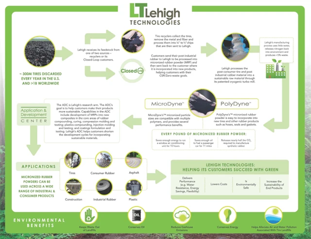 Firma z Atlanty mění staré pneumatiky a další pryžový odpad na takzvaný "mikronizovaný kaučukový prášek", který může být využit k výrobě pneumatik, plastů, asfaltu nebo stavebního materiálu. S využitím tohoto produktu již bylo vyrobeno 500 milionů pneumatik.