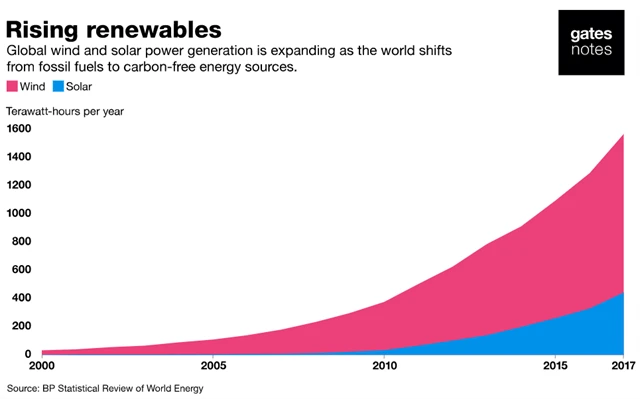 V roce 2000 byla solární a větrná energetika v plenkách, objem elektřiny vyprodukovaný elektrárnami využívajícími sluneční svit a vítr byl blízký nule. Od té doby se ovšem mnohé změnilo. V roce 2017 solární a větrné elektrárny celosvětově vyprodukovaly asi 1 600 terawatthodin energie.