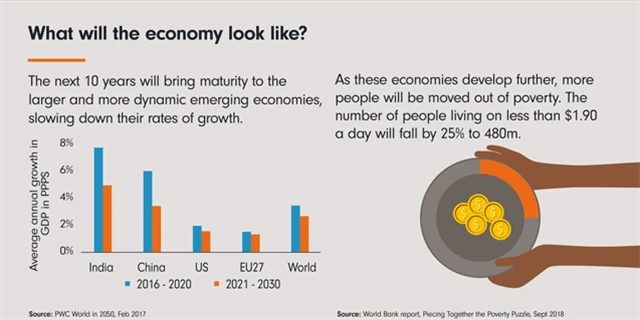 Větší a dynamičtější rozvojové ekonomiky budou dospívat a jejich růst zpomalí. S jejich dalším rozvojem klesne počet lidí pod hranicí chudoby, těch žijících za méně než 1,9 USD na den klesne o čtvrtinu na 480 milionů.