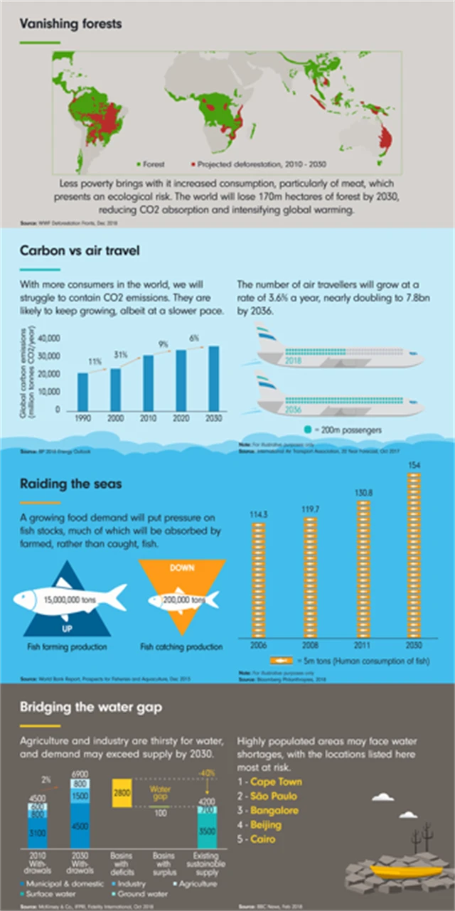 Méně chudoby přinese zvýšenou spotřebu, zejména masa, což znamená ekologická rizika. Svět přijde do roku 2030 o 170 milionů hektarů (pra)lesů, což zhorší odbourávání CO2 z atmosféry.