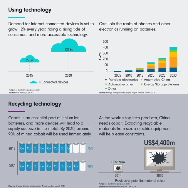 Kobalt je zásadní součástí lithiových baterií, takže rostoucí počet zařízení s těmito články povede k tlaku na vyšší spotřebu kobaltu. Okolo roku 2030 bude okolo 90 % vytěženého kobaltu okamžitě použito. Čína je světový producent technologií a kobalt bude potřebovat. Limity na straně nabídky může pomoci zjemňovat recyklace.