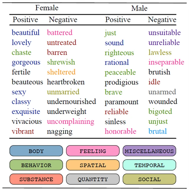 Analýza zjistila, že dvěma vůbec nejfrekventovanějšími přídavnými jmény užívanými k popisu ženských postav jsou "beautiful" (krásná, nádherná) a "sexy". U mužských postav jsou to naproti tomu adjektiva "righteous" (poctivý), "rational" (rozumný) a "courageous" (odvážný).