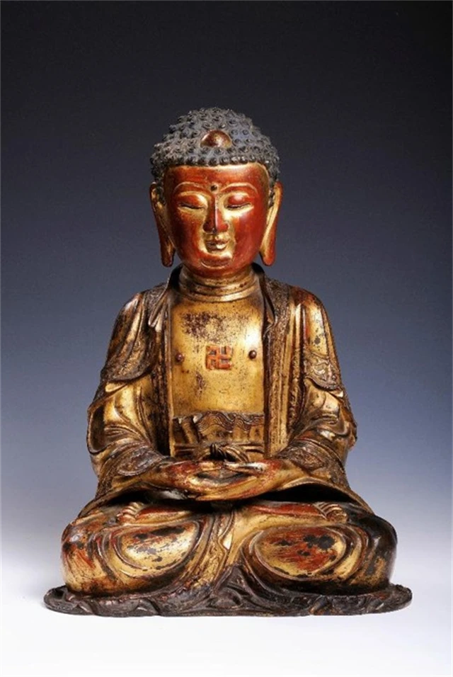 Buddha Šákjamuni je zde zobrazen v lotosovém sedu. Ruce jsou složené na sobě v meditačním gestu (dhjánamudra). Buddhovo tělo, oděné do bohatě nařaseného roucha s ozdobným květinovým pásem na okrajích, nese na hrudi symbol svastiky. Jeho klidný, ale soustředěný výraz a přivřené oči vypovídají o hlubokém pohroužení do meditace.
