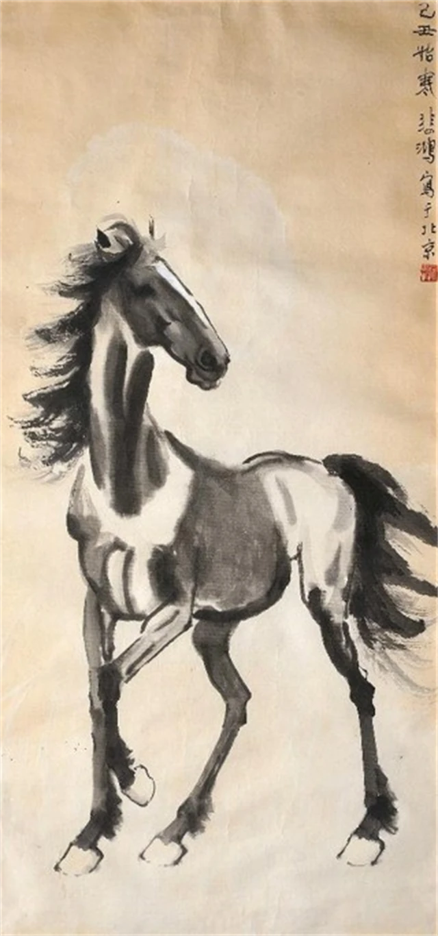 Obraz je variací na Sü Pej-chungovo oblíbené téma koně. Zde je zachycen s nadzvednutou levou přední nohou a načechranou hřívou, jakoby se právě zastavil po dlouhém cvalu. Jeho postava je namalována jistými tahy štětce, které svědčí o autorově mistrovství při zpracování tohoto námětu.