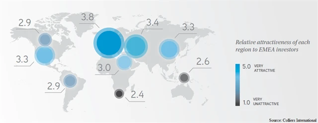 "Velcí investoři jsou při výběru lokalit stále obezřetnější a nejdříve se rozhlížejí na domácím trhu. Pokud hledají příležitosti i za hranicemi, mnohem více se zajímají o specifika jednotlivých trhů a sektorů," zdůrazňuje výkonný ředitel Colliers International Tony Horrell. Tento zájem potvrzuje i grafické vyjádření atraktivity jednotlivých světových regionů z pohledu investorů z EMEA (Evropa, Blízký východ a Afrika – pozn. red.) a USA.