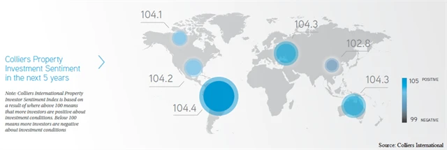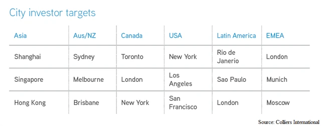 Chuť ale investory neopouští ani v případě Asie, Kanady, Latinské Ameriky nebo západní Evropy, kterou reprezentují především Londýn, Paříž a Mnichov. Globální atraktivitu šesti nejvýznamnějších realitních trhů vyjadřuje graf sestavený na základě údajů ze zprávy Colliers International (stupnice 0 až 5).