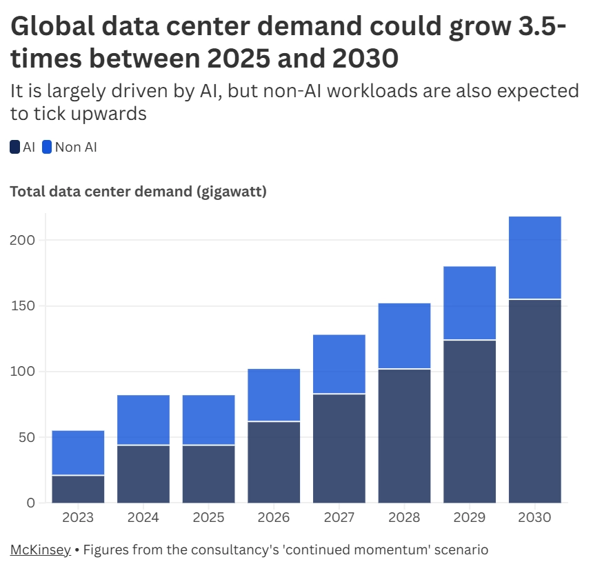 Podle analytiků ze společnosti McKinsey má přibývat datových center bezprecedentním tempem. Do roku 2030 by se jejich globální kapacita měla zdvojnásobit až ztrojnásobit, přičemž celkové investice mohou dosáhnout až 7 bilionů dolarů. Největší část této výstavby připadne na USA, ale Evropa se podle analýzy rozhodně neocitá mimo hru. Starý kontinent by měl v příštích letech skoro zdvojnásobit stávající kapacitu center, což je stále zajímavé tempo, byť výrazně pomalejší než to v USA.