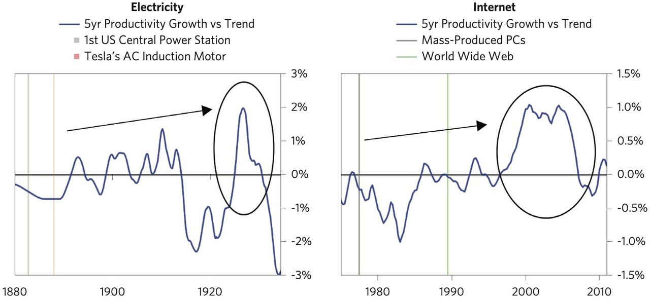 Obavy ze smysluplnosti masivních investic do AI nicméně nejsou v historickém kontextu překvapivé. Když se na přelomu 19. a 20. století ve velkém "rozjela" elektrifikace, investoři nadšeně sázeli na výrobce generátorů a elektrických zařízení. Jenže nakonec zažili rozčarování. Ekonomické přínosy elektřiny se totiž naplno projevily až o dekády později a paradoxně nejvíce u firem, které elektřinu využívaly ve výrobě, ne u těch, které se nejvíce zasloužily o její nástup.